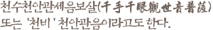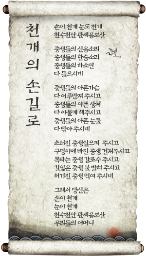"õ" Àº ¹«·®.¿ø¸¸ÀÇ ¶æÀ̰í "õ¼ö"´Â ÀÚºñÀÇ ±¤´ëÇÔÀ», "õ¾È"Àº ÁöÇýÀÇ ¿ø¸¸.ÀÚÀçÇÔÀ» ³ªÅ¸³½´Ù. õ°³ÀÇ ¼Õ¹Ù´Ú ÇϳªÇϳª¿¡ ´«ÀÌ ÀÖ¾î, ¸ðµç »ç¶÷ÀÇ ±«·Î¿òÀ» ±× ´«À¸·Î º¸°í, ±× ¼ÕÀ¸·Î ±¸Á¦ÇϰíÀÚ ÇÏ´Â ¿°¿øÀ» »ó¡ÇÑ´Ù. ((»ï±¹À¯»ç))¿¡´Â õ¼ö°üÀ½¿¡°Ô ºô¾î ´«¸Õ ¾ÆÀ̰¡ ´«À» ¶ß°Ô µÇ¾ú´Ù´Â ±â·ÏÀÌ ÀÖ´Ù. õ¼ö°üÀ½Àº °üÀ½½Å¾ÓÀÇ À¯Æ÷¿Í ÇÔ²² ¹Î°£¿¡ ±íÀÌ ½º¸çµé¾ú´Ù.